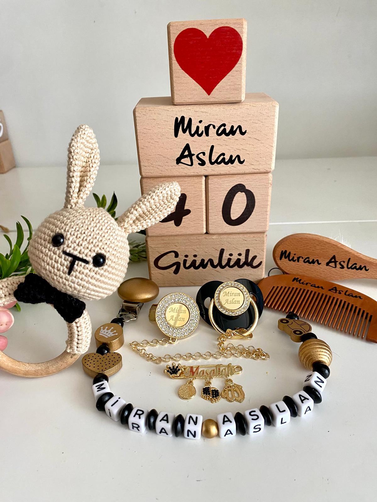 Set İçeriği: İsimli emzik ve zinciri. Ahşap emzik askısı. Maşallah iğne. Saç fırçası ve tarağı. Ahşap anı küpleri. Diş kaşıyıcı çıngırak.