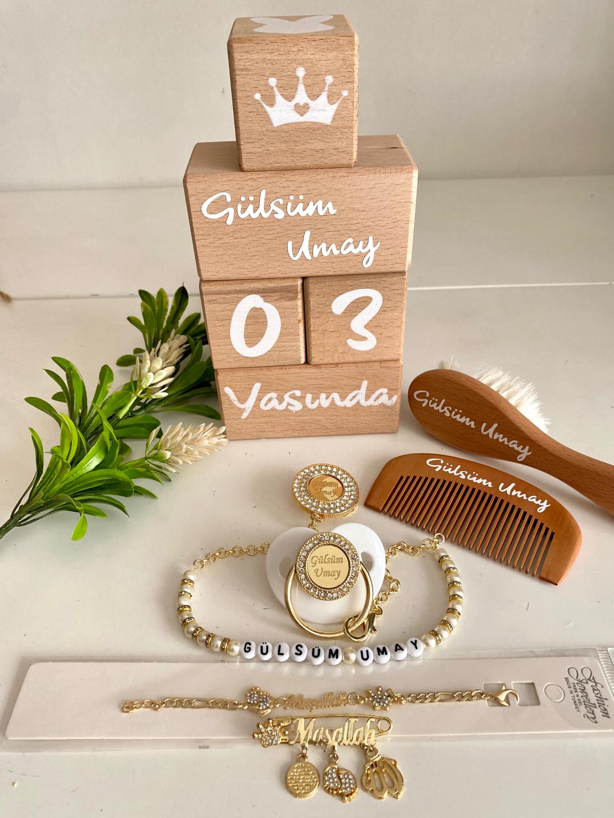 Set İçeriği: İsimli emzik ve zinciri. Maşallah iğne ve bileklik. Saç fırçası ve tarağı. Ahşap anı küpleri.