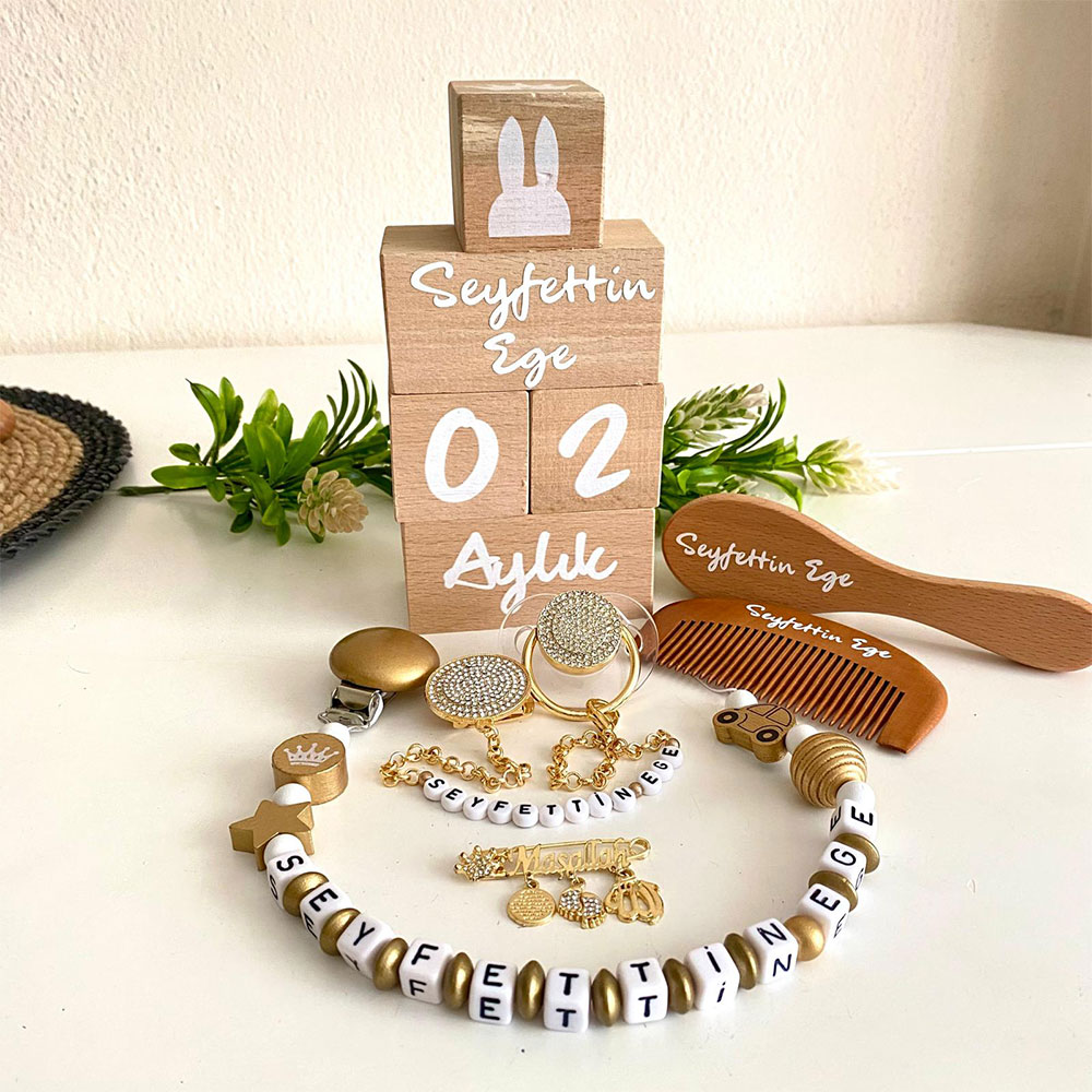 Set İçeriği: Taşlı emzik ve zinciri. Ahşap emzik askısı. Maşallah iğne. Saç fırçası ve tarağı. Ahşap anı küpleri.