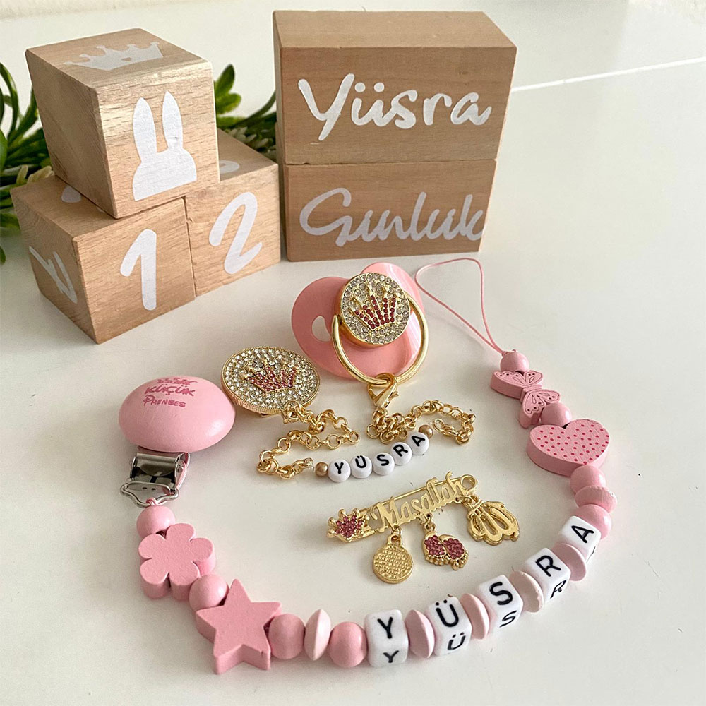 Set İçeriği: Pembe taçlı emzik ve zinciri. Ahşap zinciri. Maşallah iğne. Ahşap anı küpleri.