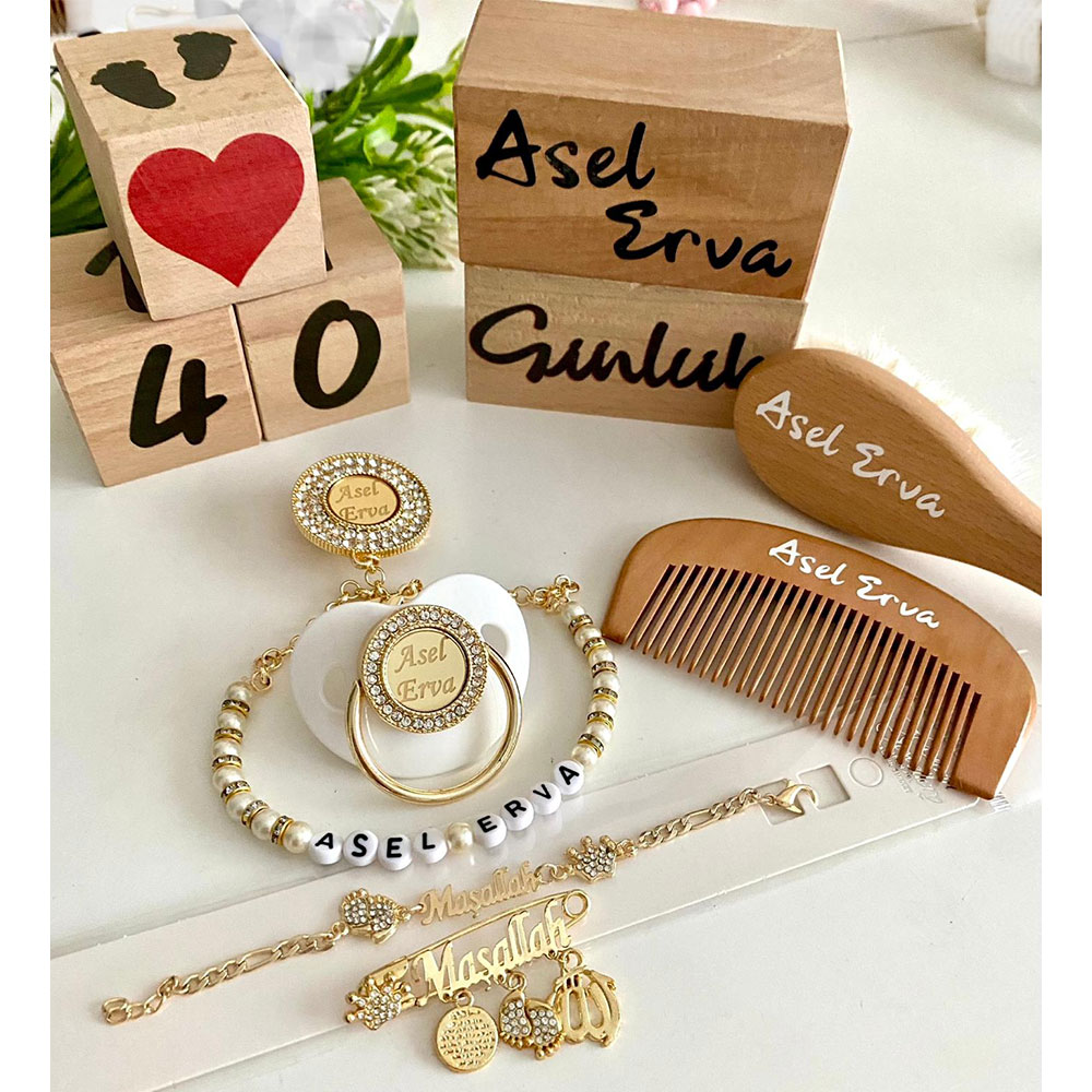 Set İçeriği: İsimli emzik ve zinciri. Maşşalah iğne ve bileklik. Saç fırçası ve tarağı. Ahşap anı küpleri.