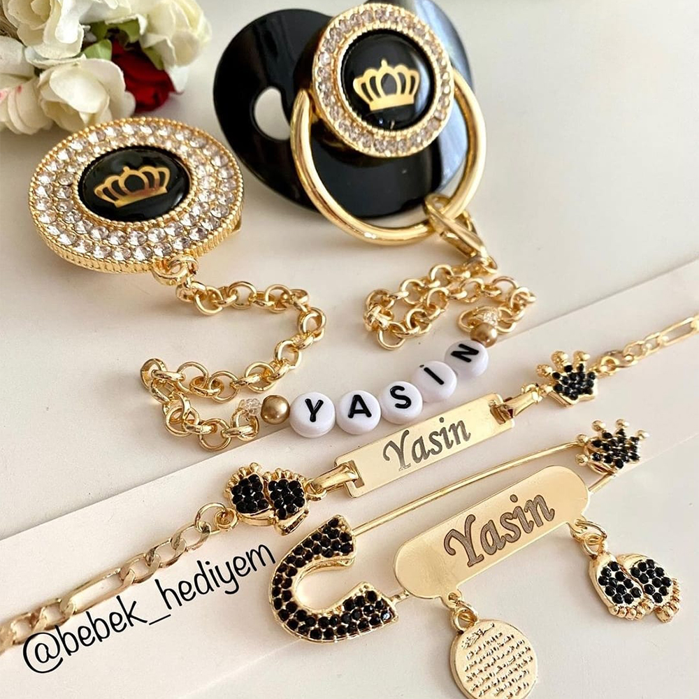 Set İçeriği: Taçlı emzik ve zinciri. İsimli iğne. İsimli künye.