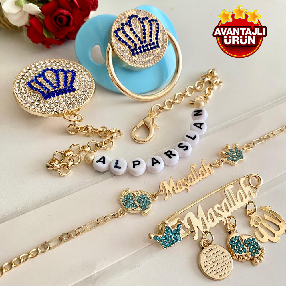 Set İçeriği: Taçlı emzik ve zinciri. İsimli iğne. İsimli künye.