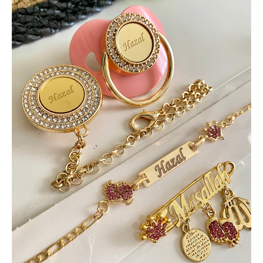 Set İçeriği: İsimli emzik ve zinciri. Maşallah iğne. İsimli künye.