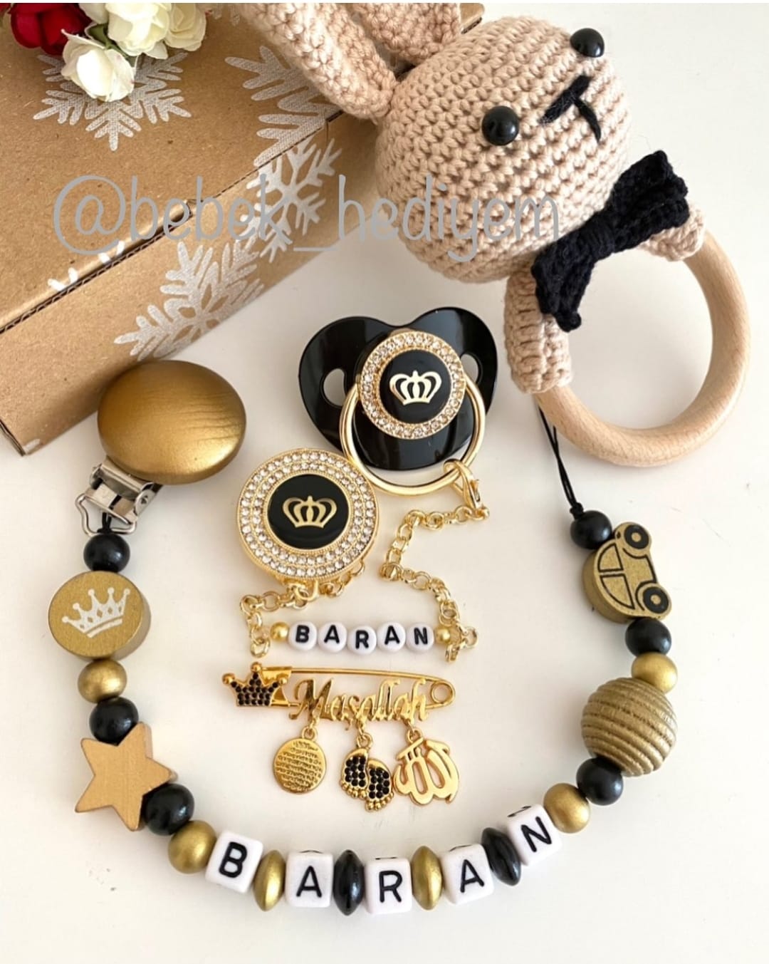 Set İçeriği: Taçlı emzik ve zinciri. Ahşap emzik askısı. Maşallah iğne. Diş kaşıyıcı çıngırak.