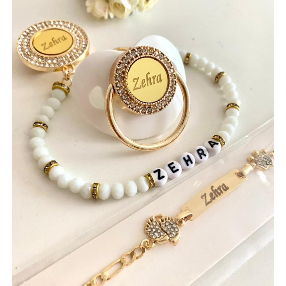Set İçeriği: İsimli emzik ve zinciri. İsimli künye