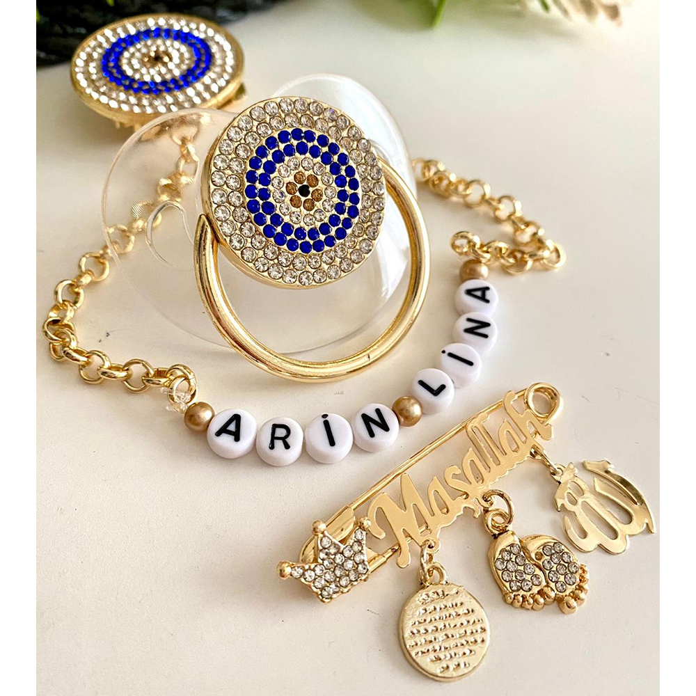 Set İçeriği: Nazar boncuklu emzik ve zinciri. Maşallah iğne.