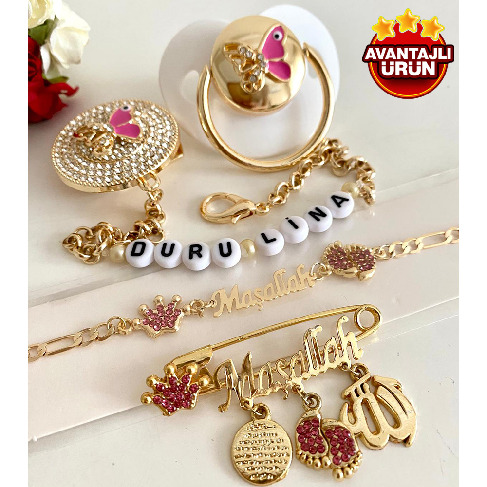 Set İçeriği: Kelebekli emzik ve zinciri. Maşallah iğne. Maşallah künye.