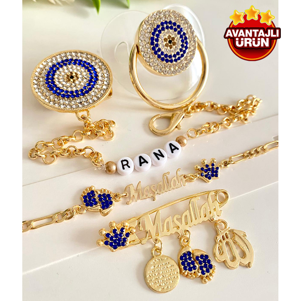Set İçeriği: Nazar boncuklu emzik ve zinciri. Maşallah iğne. Maşallah bileklik.