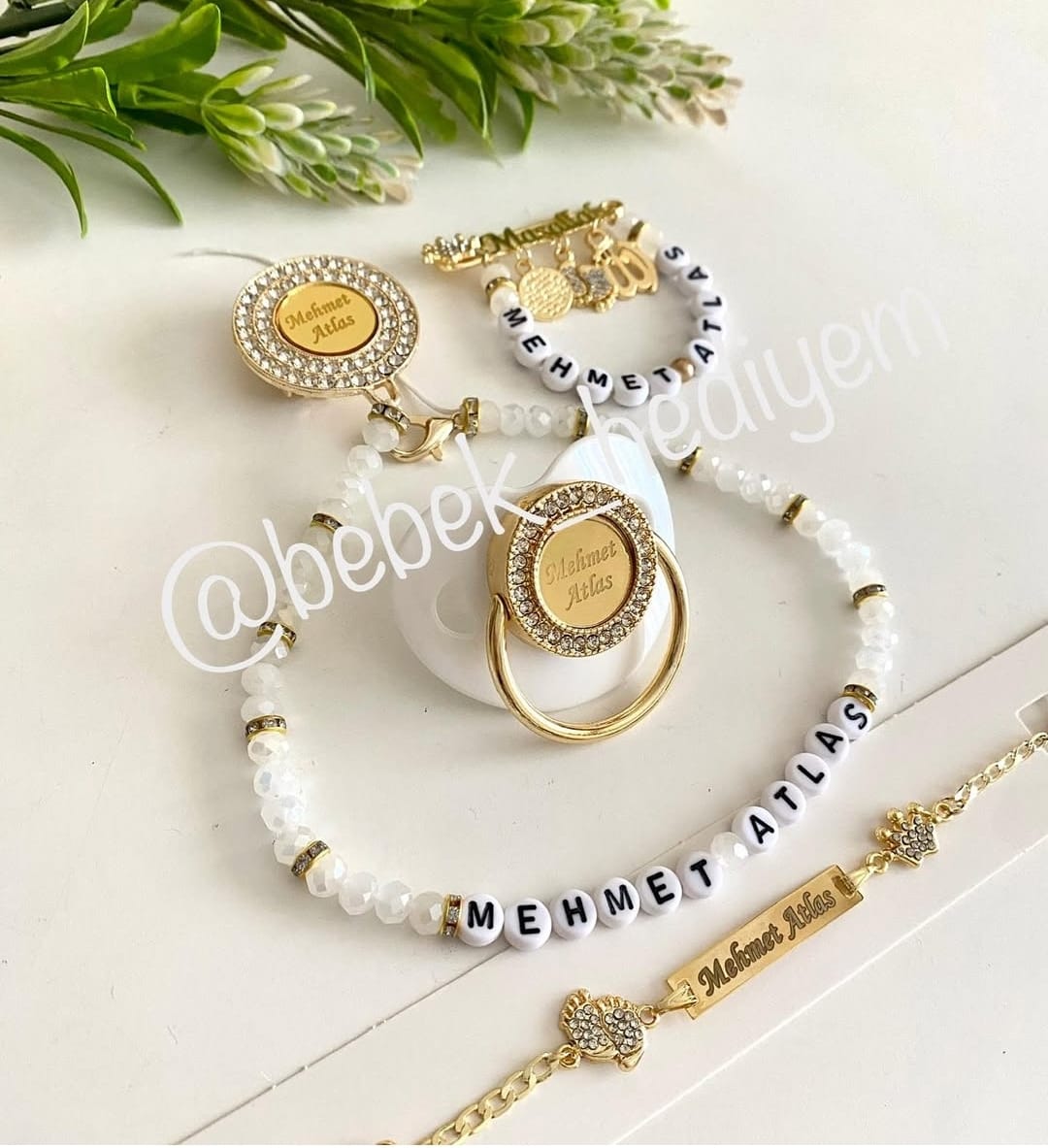 Set İçeriği: İsimli emzik ve zinciri. İsimli maşallah iğne. İsimli künye