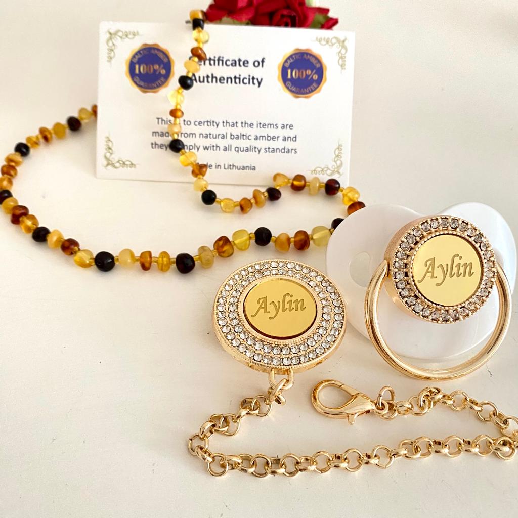 Set İçeriği: İsimli emzik ve zinciri. Kehribar kolye