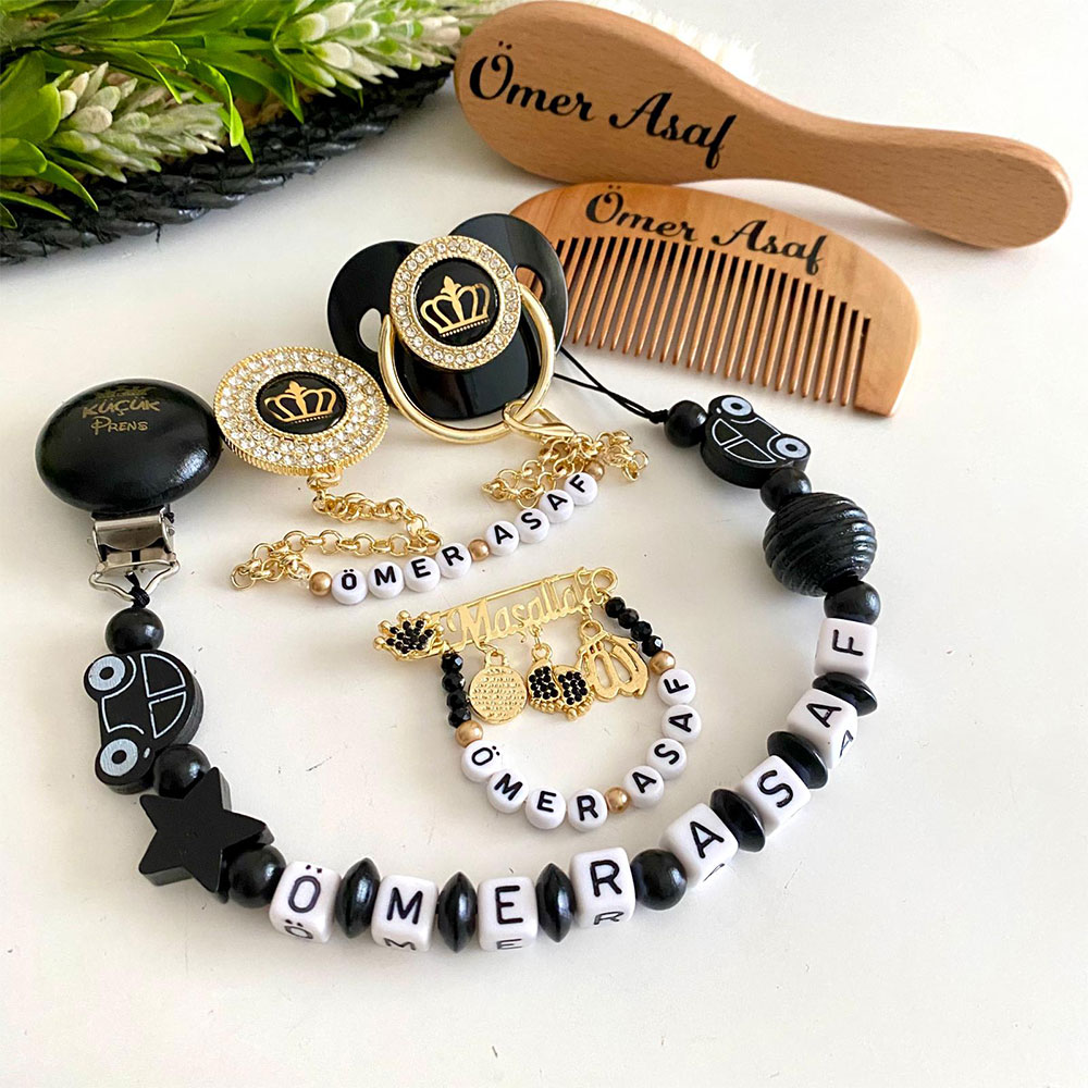 Set İçeriği: Taçlı model emzik ve zinciri. İsimli yaka iğne. Ahşap emzik zinciri. İsimli tarak ve fırça.