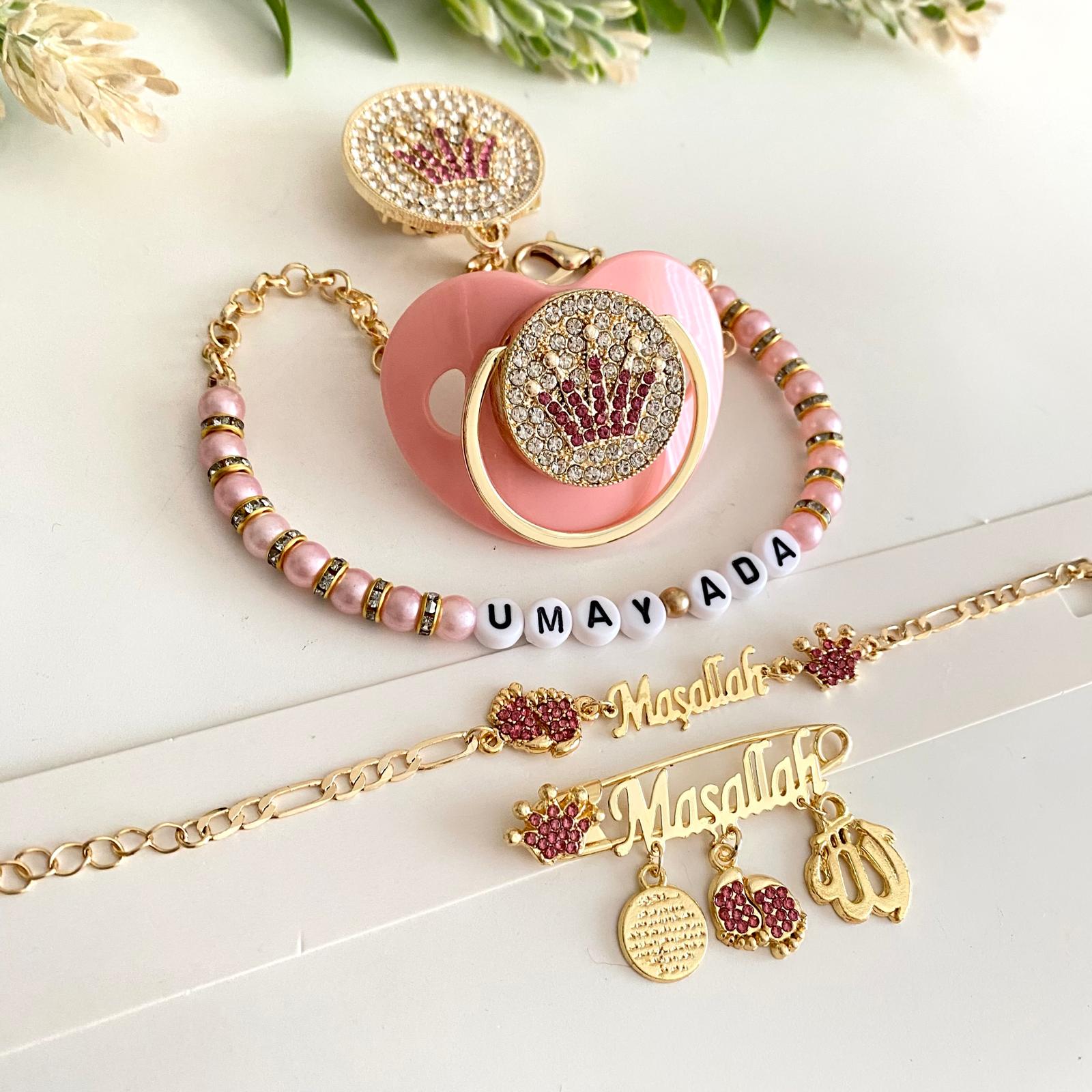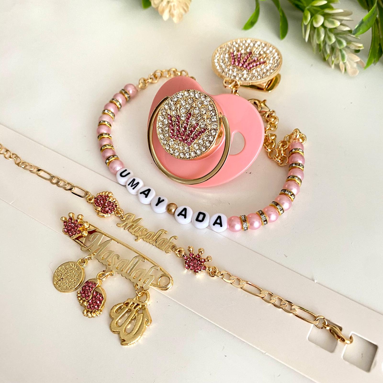 Set İçeriği: İsimli emzik ve zinciri. İsimli maşallah iğne. Maşallah bileklik.