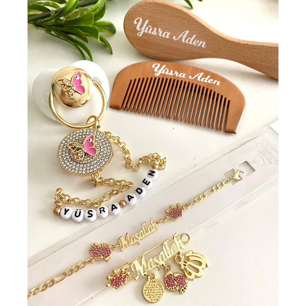 Set İçeriği: Pembe kelebek model emzik ve zinciri. Maşallah yaka iğne. Maşallah bileklik İsimli tarak ve fırça.