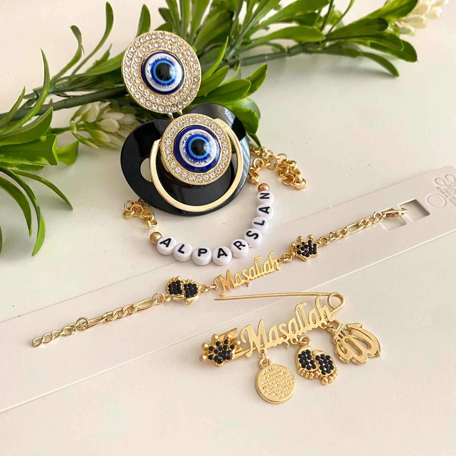 Set İçeriği: Nazar boncuklu emzik ve zinciri. Maşallah iğne. Maşallah bileklik.