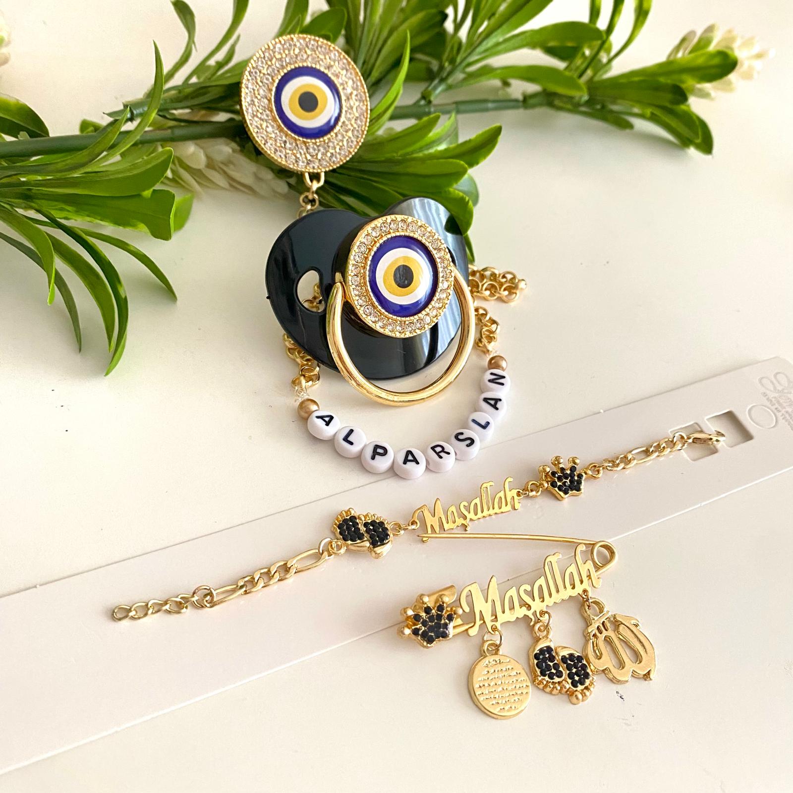 Set İçeriği: Nazar boncuklu emzik ve zinciri. Maşallah iğne. Maşallah bileklik.