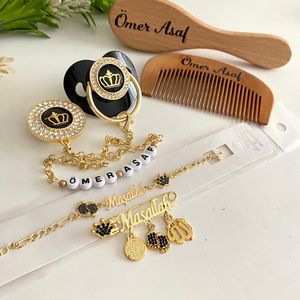 Set İçeriği: Siyah taçlı model emzik ve zinciri. Maşallah yaka iğne. Maşallah bileklik. İsimli tarak ve fırça.