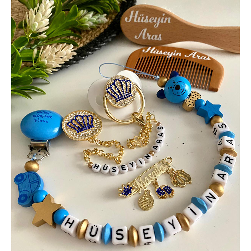 Set İçeriği: Taçlı model emzik ve zinciri. Ahşap emzik askısı. Maşallah yaka iğne.  İsimli tarak ve fırça.