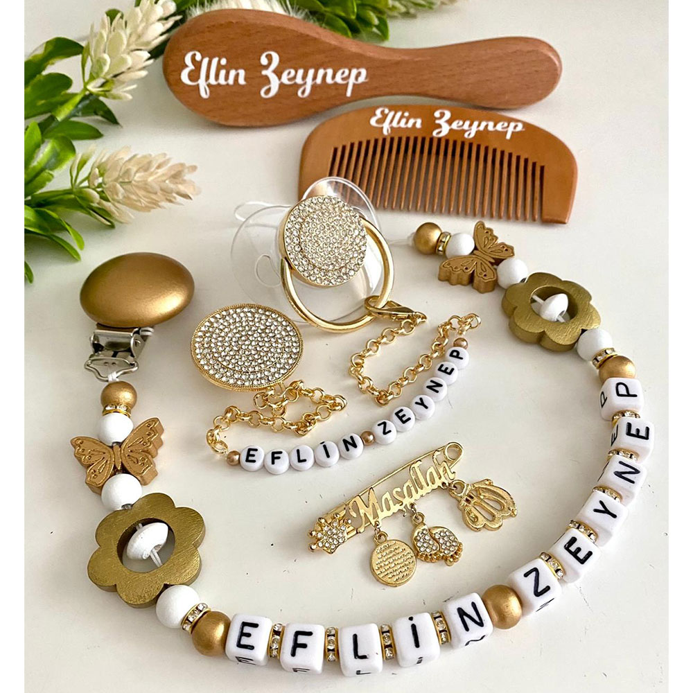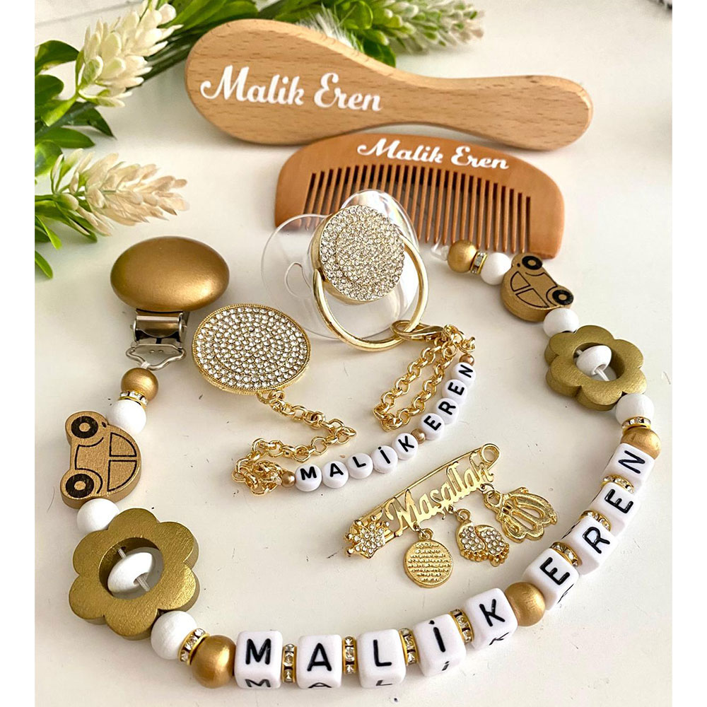 Set İçeriği: Taşlı emzik ve zinciri. Ahşap emzik askısı. Maşallah yaka iğne. İsimli tarak ve fırça.
