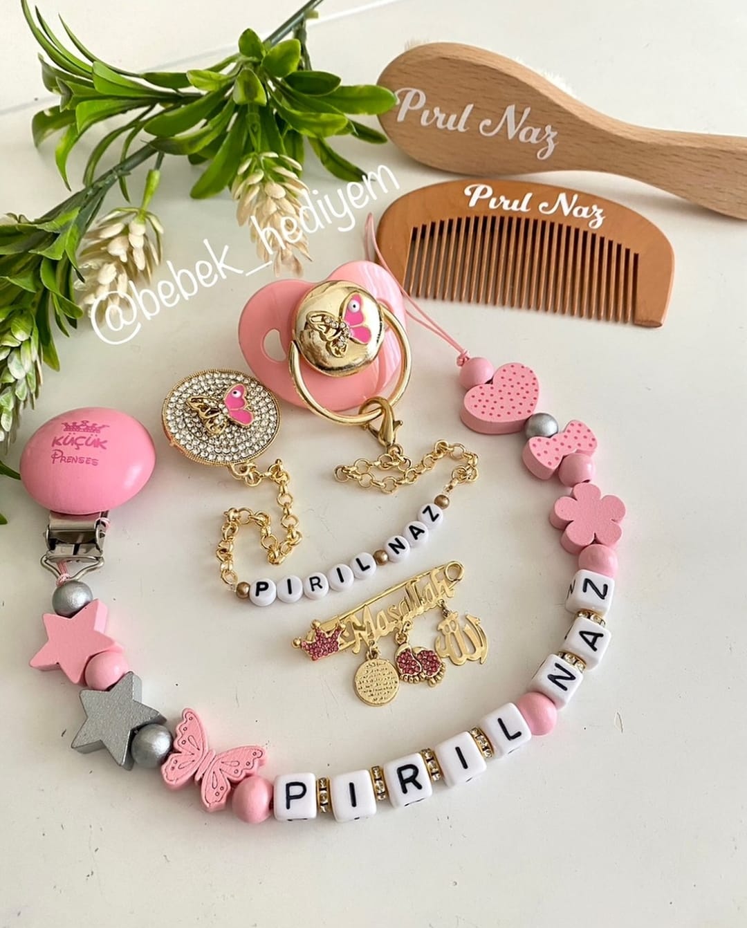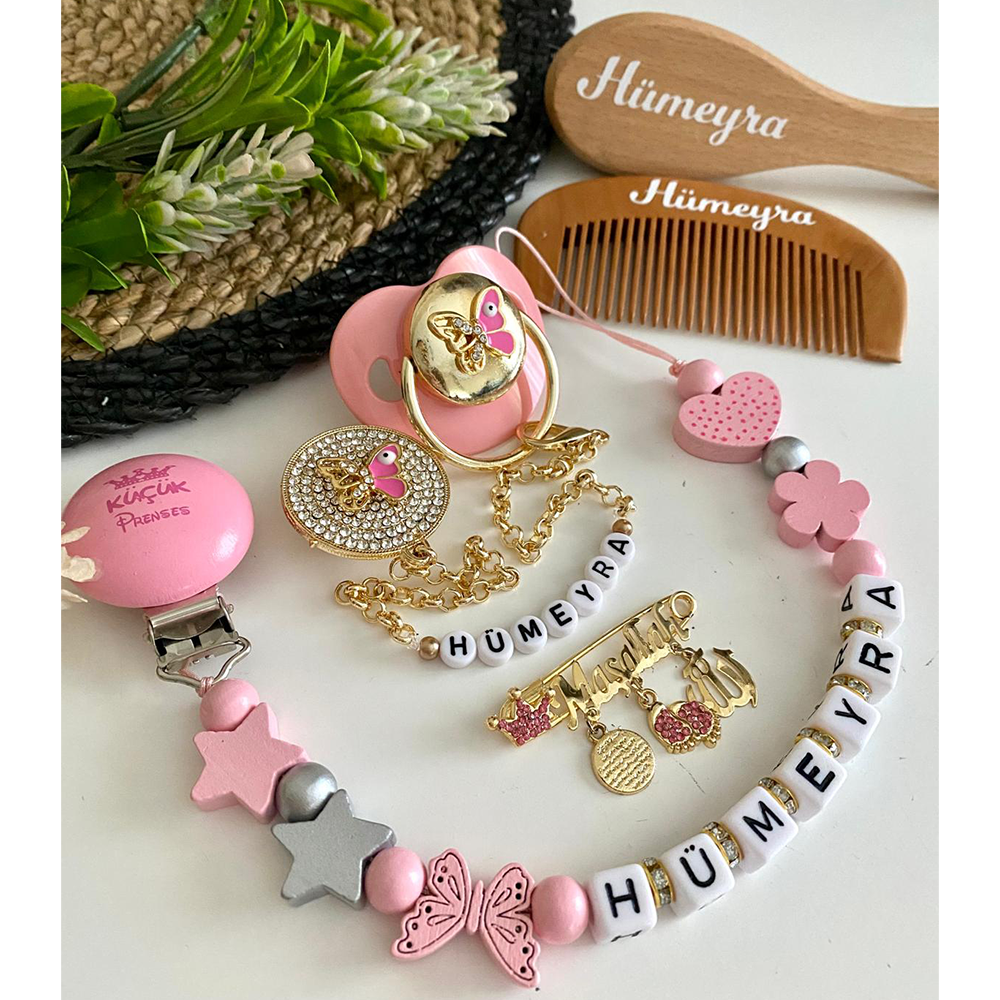 Set İçeriği: Taşlı emzik ve zinciri. Ahşap emzik askısı. Maşallah yaka iğne. İsimli tarak ve fırça.
